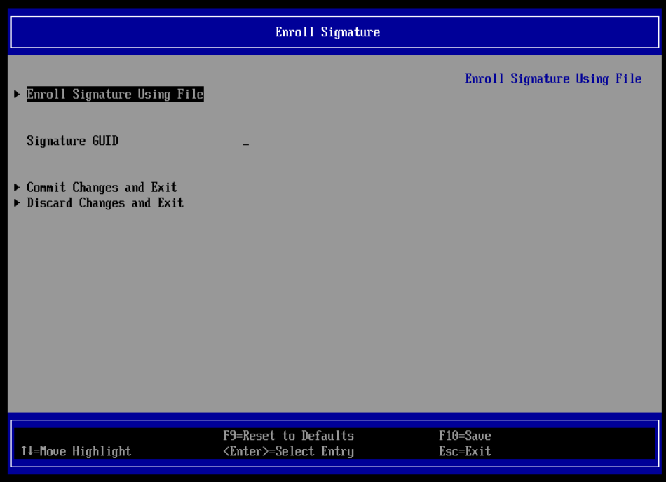 Ahora debemos importar la clave directamente en el firmware UEFI. Reinicia el sistema y entra en la configuración UEFI/BIOS (normalmente presionando F2, F10, Del o Esc durante el arranque).