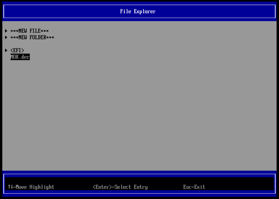 Navega a la partición EFI donde copiamos el archivo MOK.der: